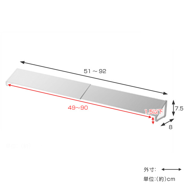 | サイズ | 約 幅51〜92×奥行8×高さ7.5(cm) 対応サイズ: 幅約49〜90cmまでのビルトインガスコンロ、IHクッキングヒーターに対応。 排気口カバーの高さ: 約1.5cm以下に対応。 |