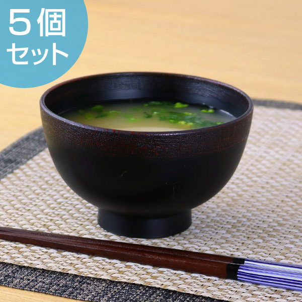 石川県山中塗で作られている汁椀 5個セットキズがつきにくく丈夫なプラスチック製。軽くて割れにくく、お子様でも扱いやすい合成漆器です。