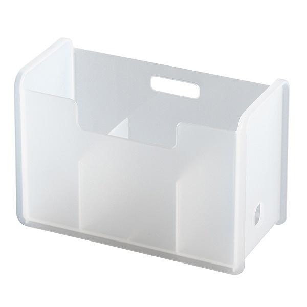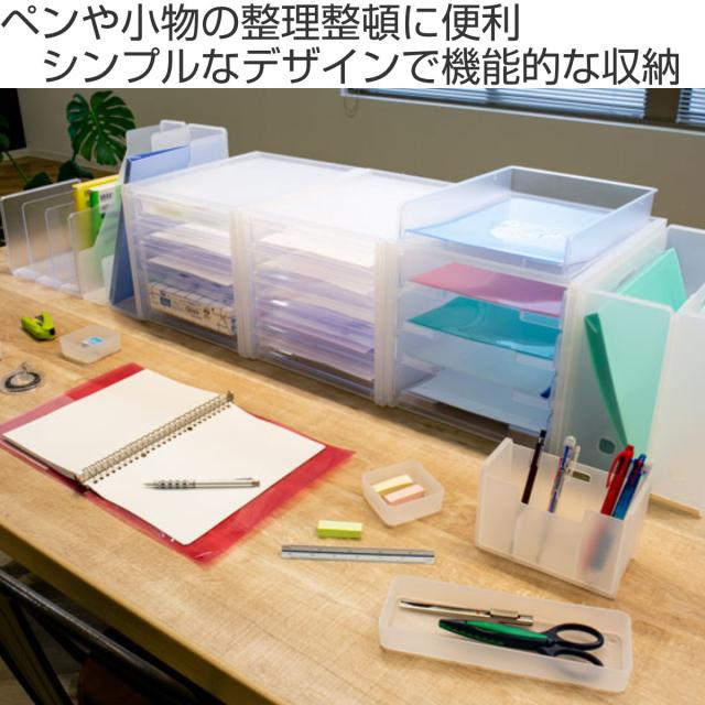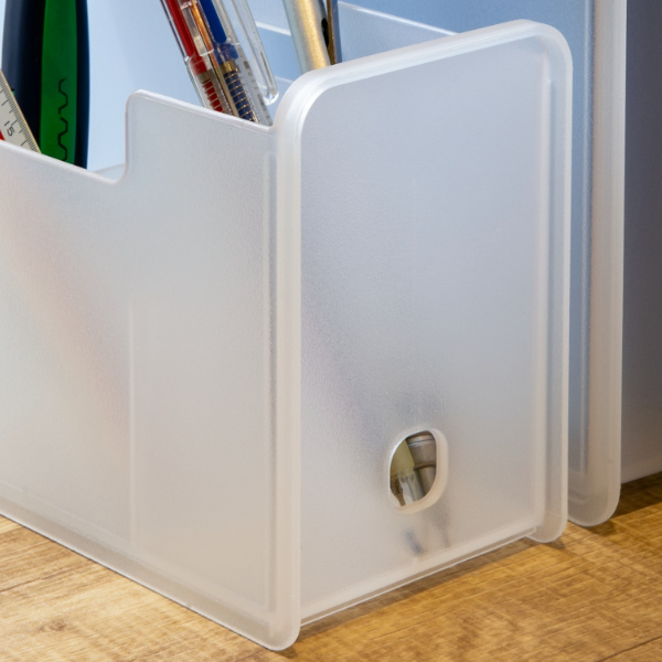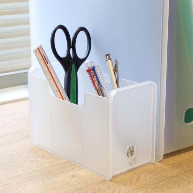 半透明で中身がほどよく透けて見えます。収納物が分かりやすく、シンプルでお部屋に溶け込む文具収納です。