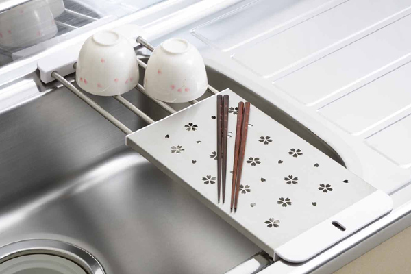 伸縮式なのでご家庭のシンクのサイズに合わせてお使いいただけます。水切り台としてだけでなく、作業スペースとしても大活躍。狭いキッチンでとても重宝します。