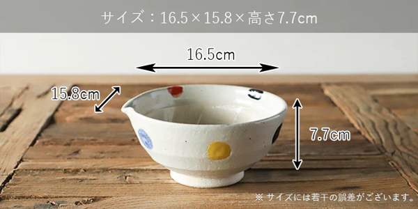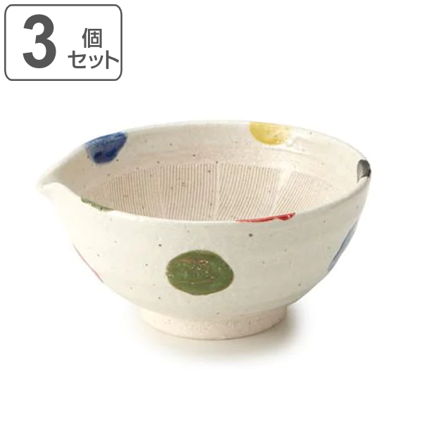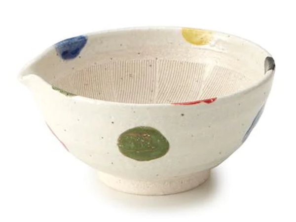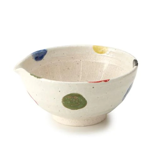 手描き風の5色の水玉模様が愛らしい陶器製片口すり鉢です。便利な注ぎ口付きで、ドレッシングやタレを作ってそのまま食卓に出せます。器としても使える可愛いデザインは、お料理に彩りを添え、おもてなしのテーブルコーディネートにもぴったりです。