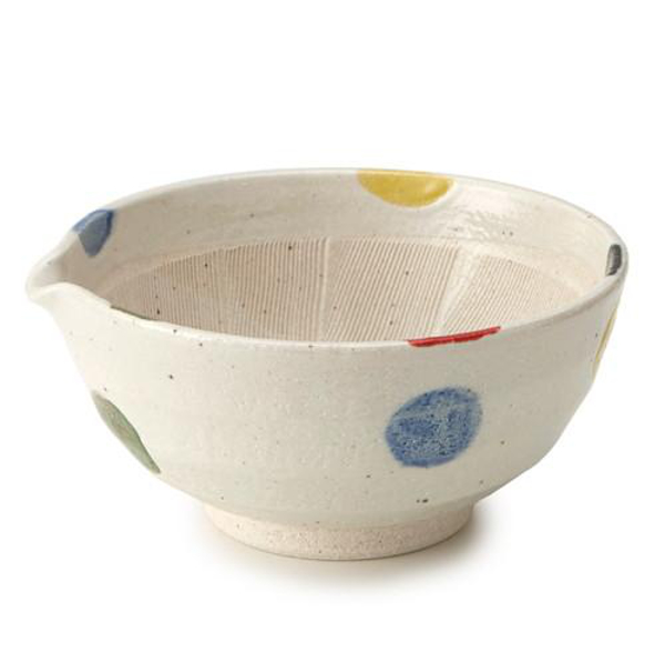 手描き風の5色の水玉模様が愛らしい陶器製片口すり鉢です。便利な注ぎ口付きで、ドレッシングやタレを作ってそのまま食卓に出せます。器としても使える可愛いデザインは、お料理に彩りを添え、おもてなしのテーブルコーディネートにもぴったりです。