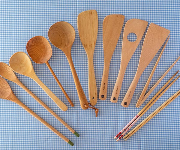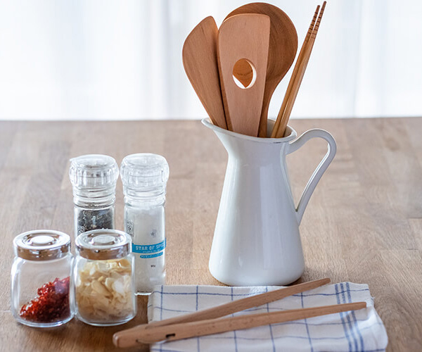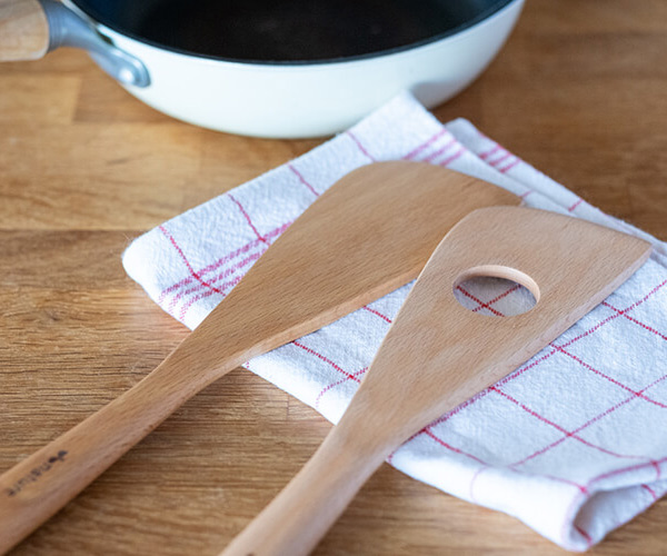 1〜2ヶ月に1回程度、オリーブオイル等のオイルを布に含ませてから木製キッチンツールの全体を拭いて、日陰に半日ほど置いて乾燥させれば、オイルのベタベタもにおいもなくなり表面に艶が出てきます。さらに使い込むほどに味わいが出てくる木製のキッチンツールです。