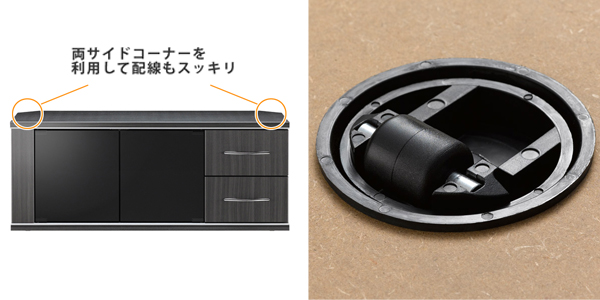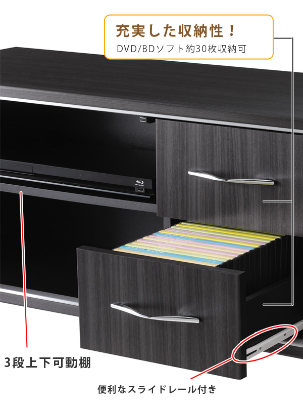 ![]() ![]() 充実した収納性!満足度を追求したTVボード アッシュグレーがかっこいい、スタイリッシュなテレビボードです。上下に走るシルバーラインはAV機器との絶妙なマッチング感を演出してくれます。42V型までのテレビに対応しています。 ※テレビサイズは、メーカー・機種により、重量・大きさが異なりますので、ご確認の上ご使用ください。 ![]() 充実した収納力でTV周りもスッキリ 引き出しやすいスライドレールが付いた引き出しが2ヵ所、フルクローズガラス扉、更に背面収納付きで収納力は抜群です。引き出しにはDVDが約30枚収納できます。ガラス扉の中には3段上下可動できる棚板が付いているので、中に収納する機器の大きさに合わせて動かすことができ便利です。 ![]() 背面もスッキリ充実 背面には電源タップやルーターなどを収納できるスペースがあります。背板には必要に合わせて切り抜きできる配線口があるので、ごちゃつく配線もスッキリおさまります。 ![]() ![]()