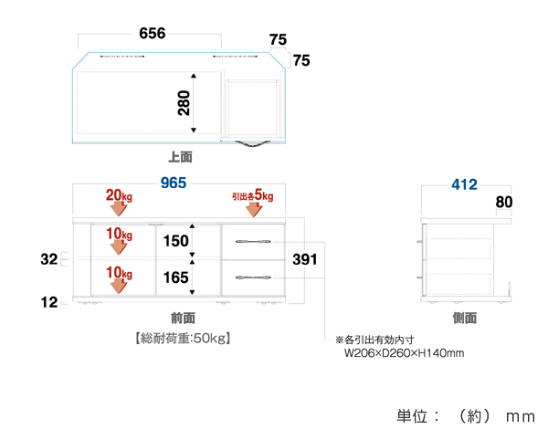 天板:20kg、棚板:10kg、引き出し:5kg