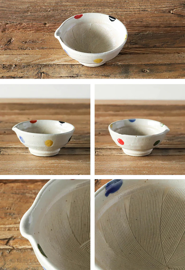 水玉模様のすり鉢シリーズは、片口お椀タイプとすり鉢タイプの2つの形があり、使い方やお好みに合わせて選んでいただけます。