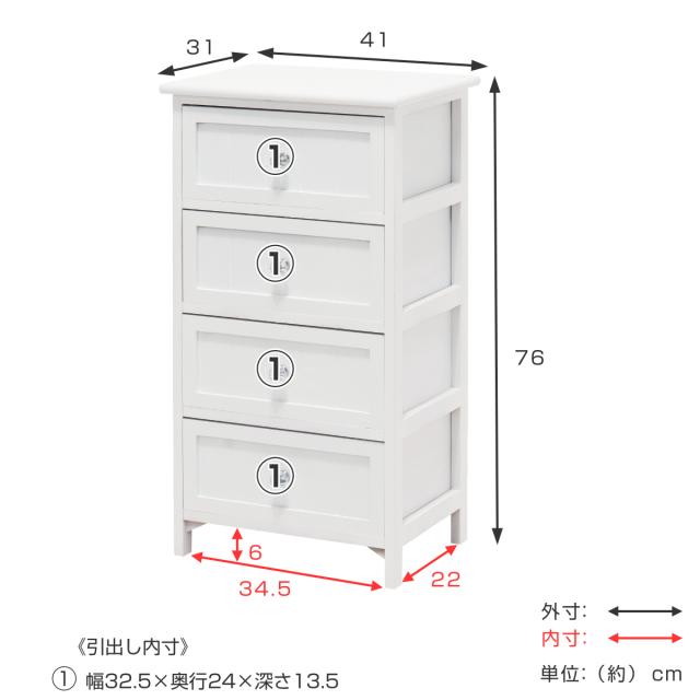 ホワイトシャビーテイストのチェスト 4段