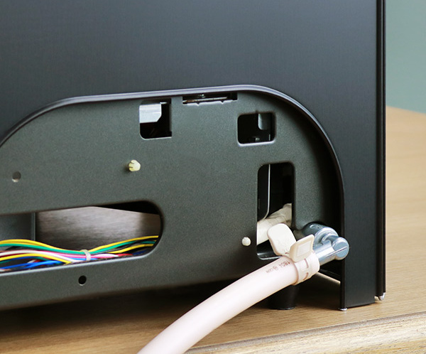 据え置き用コンロとガス栓をつないでいるゴムホースの邪魔をしないように、レンジガードにはホースを出す穴があります。レンジガードはリバーシブル仕様なので、ガスのホースが左右どちらについていても対応できます。