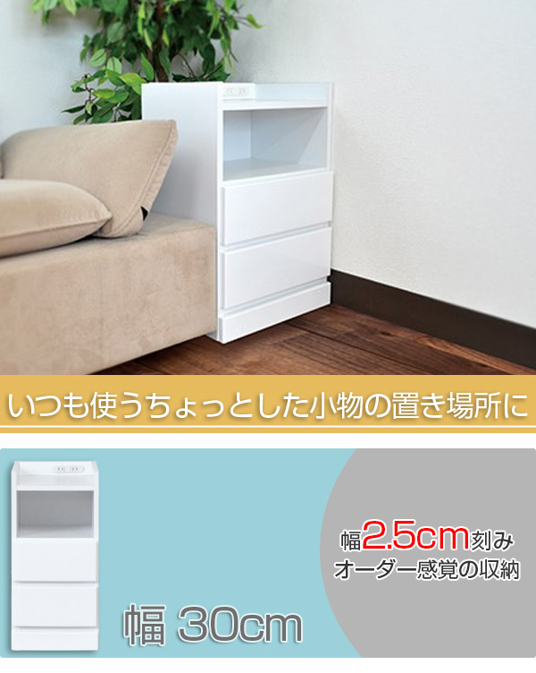 ![]() ![]() お部屋のちょっとしたすき間に置けるサイドチェスト お部屋のちょっとしたすき間に置けるサイドチェストです。いつも使う携帯やテレビのリモコンなど、ちょっとした小物を置く場所に困ったことはありませんか? 限られたスペースや諦めていたすき間をフル活用して、欲しいものにすぐに手が届く快適な空間に・・・ ![]() すき間にぴったりのサイズを選べる 幅20cm〜40cmを2.5cm刻みにした豊富なサイズなのであらゆるすき間にぴったりと置くことができ、わずかなスペースを有効活用できます。 ![]() 便利な2個口コンセント付き ベットサイドやソファサイドなどで使うときに役立つ2個口コンセント付きです。携帯電話の充電や読書時の照明などの電源に使えて便利です。 ![]() ![]()