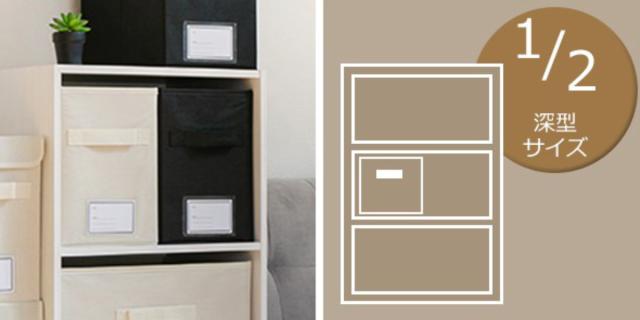 市販のカラーボックス半分にぴったり収まるハーフサイズです。深さがあるので効率よく収納できます。