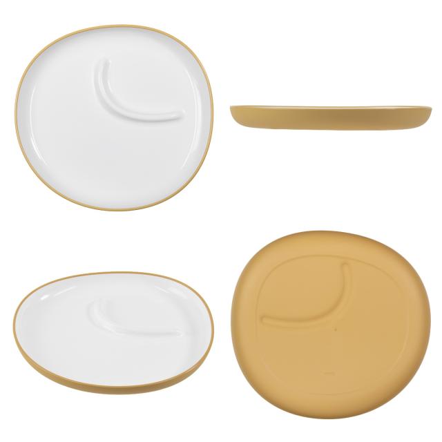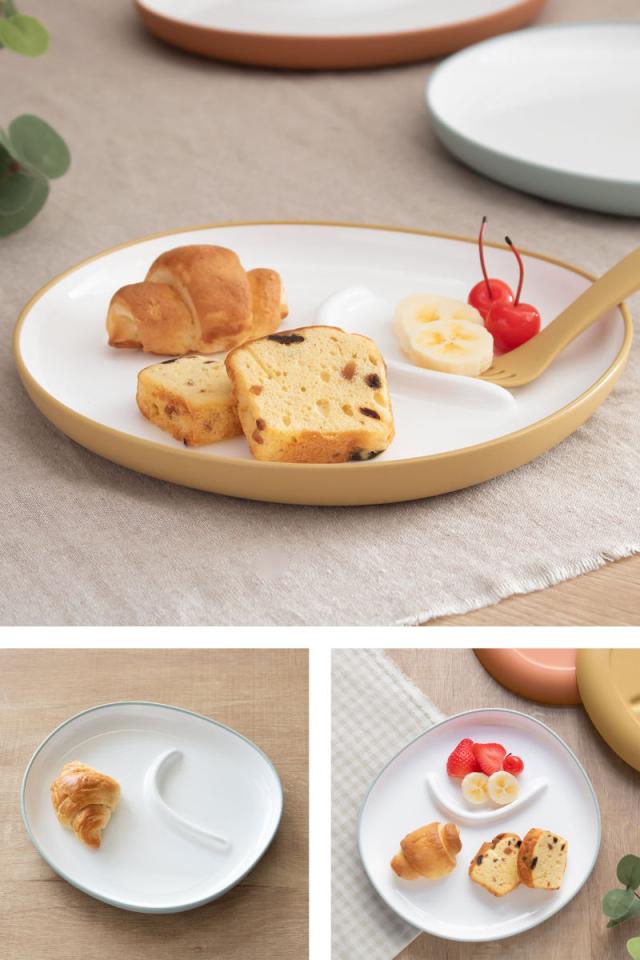 ごはんやおやつをワンプレートに盛り付けられる仕切り付きのプレートで、手づかみ食べのスタート時期(9ヶ月頃)のお子様にぴったりです。シンプルでありながら、柔らかな輪郭がおしゃれなデザインです。料理が映えるホワイトとくすみカラーの組み合わせが食卓に優しく馴染みます。