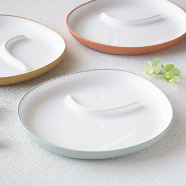 便利な仕切り付きで、ごはんやおかずと分けてデザートの盛り付けが簡単にできます。また、仕切り部分には同シリーズのボウルやスープマグがぴったりとフィットするので、一緒に使っていただくとスープや汁気のあるおかずもワンプレートにできます。