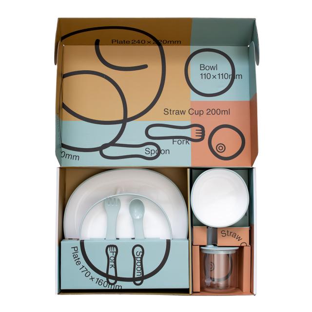 ボウル1個、プレート小1枚、プレート大1枚、ストローカップ1個、スプーンとフォークが各1本ずつ入っています。