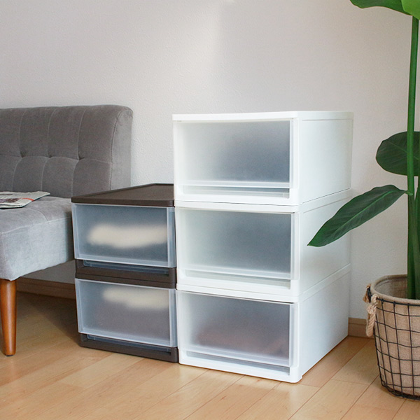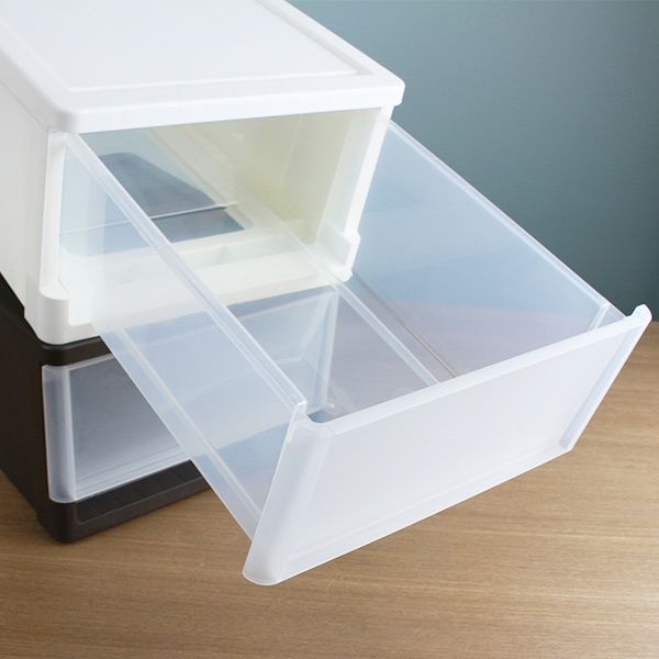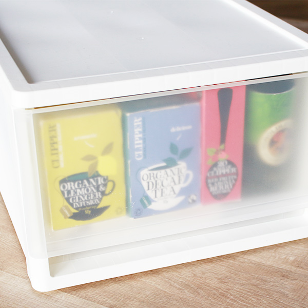 中がうっすら見える、すりガラス調の引出しです。しまったものをすぐに見つけられるため、迷わず出し入れできます。見えすぎないところも嬉しいポイントです。