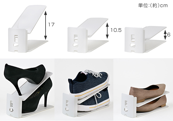 片足分のスペースで1足分置けるので、収納量が2倍になり、沢山靴をお持ちの方や、家族が多い方にとてもおすすめです。しっかりと靴を支えてくれるので、型崩れしにくく綺麗に保てます。そのため、靴を重ねて下駄箱に入れている方にもおすすめです。