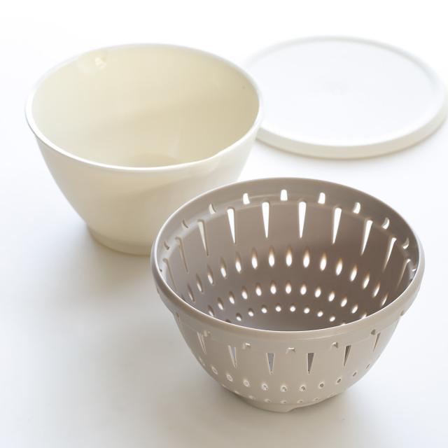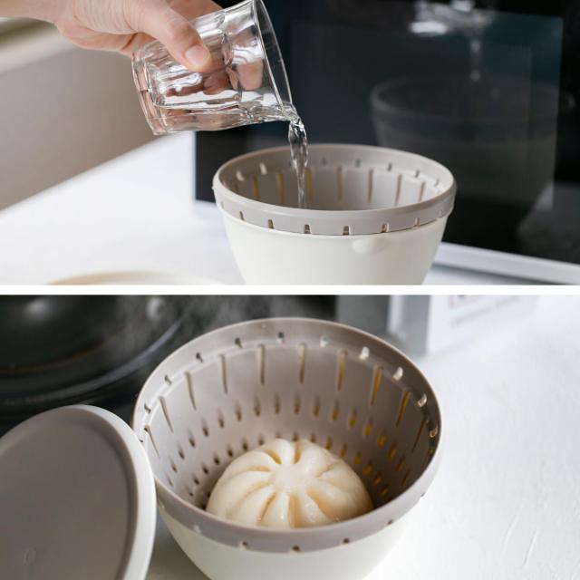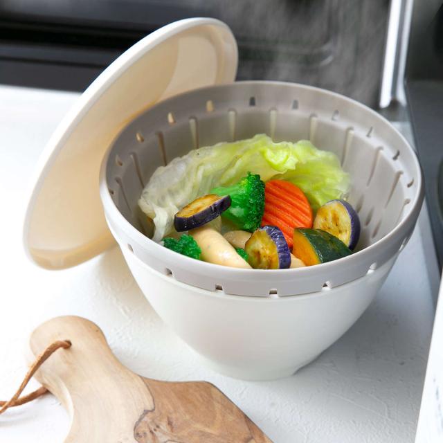 耐熱の素材なので、電子レンジでそのまま加熱することができます。ボールにセットしたコランダーの中に食材を入れ、ラップ代わりにフタを閉めることで電子レンジを使った料理もスピーディーにでき、時短につながります。コランダーの穴から余分な水分や油が落ちるので、食材本来の美味しさをよりしっかり味わうことができます。