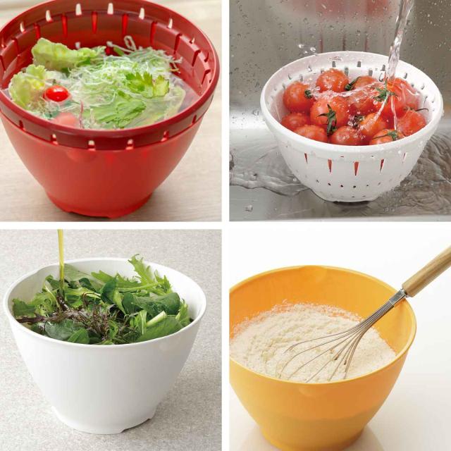 同シリーズは、ボール&コランダーセット、ボール、コランダーの単品と、種類もカラーも豊富なので、自分好みのカラーやサイズを組み合わせてカスタマイズしていただけます。調理の用途などによって上手に複数のボールやザルを使い分ければ、多くの食材を同時進行で調理でき、食材の大きさに合ったものを使うことができます。