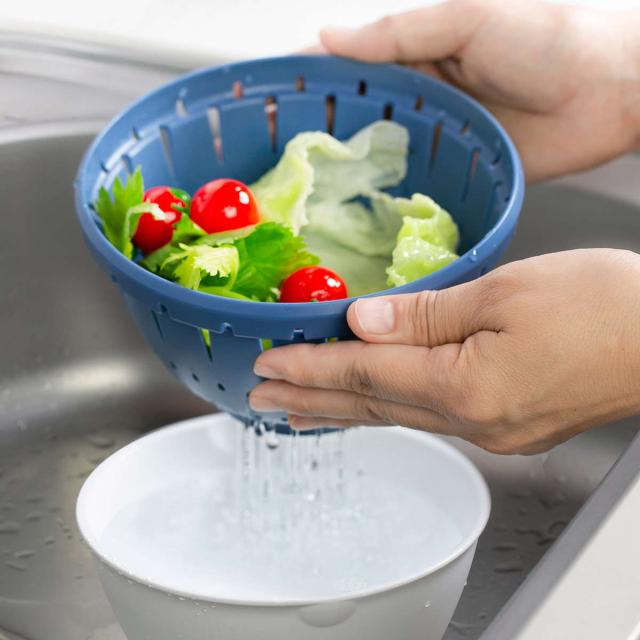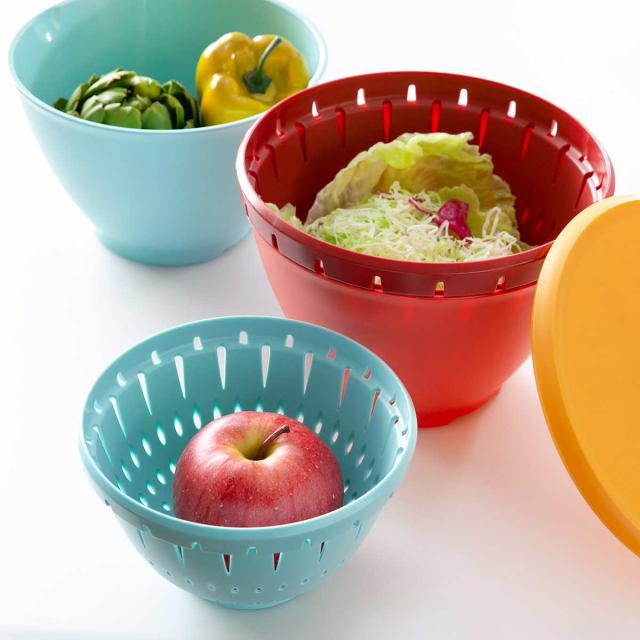 食材を洗う時に、ボールに重ねたままでもコランダーに空いた穴から水が流れる設計になっているので、水と一緒に食材が流れ出てしまうのを防いでくれます。