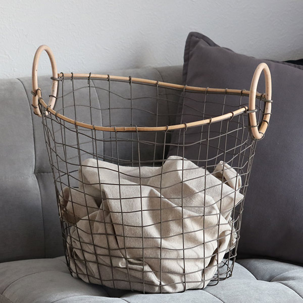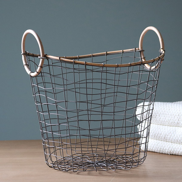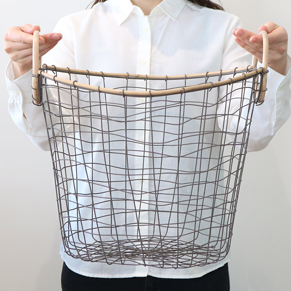 ランダムに張られた表情豊かなワイヤーと、やさしい印象のラタンの異素材を組み合わせたバスケットです。無機質のなかに天然素材の温かさを感じるデザインです。