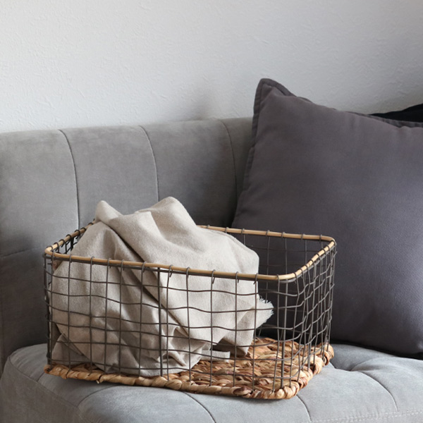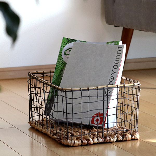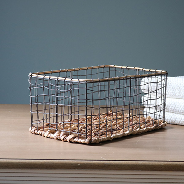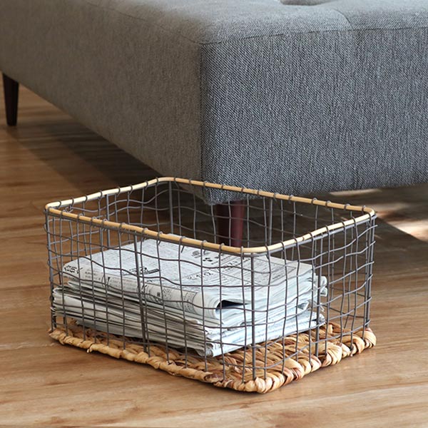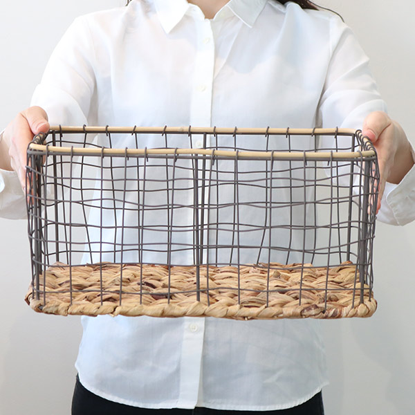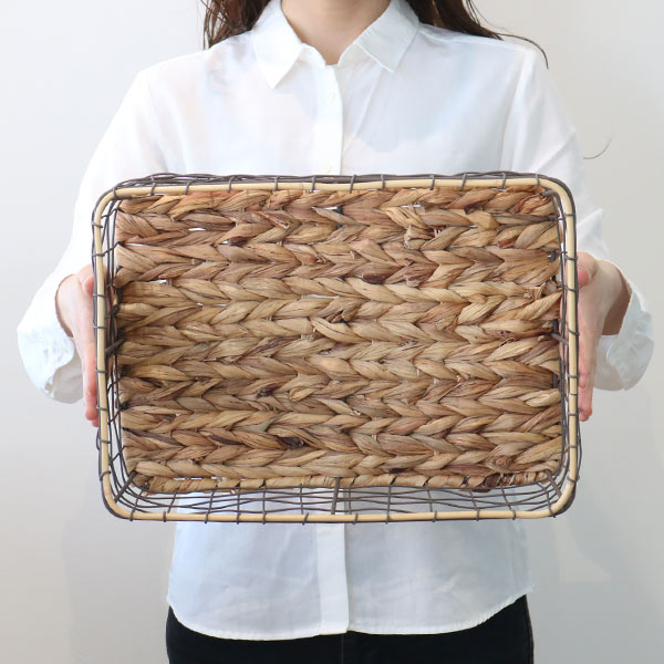 ランダムに張られた表情豊かなワイヤーと、やさしい印象のラタンとウォーターヒヤシンスの異素材を組み合わせたバスケットです。無機質のなかに天然素材の温かさを感じるデザインです。