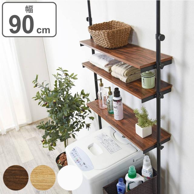 ランドリーラック 突っ張り 幅90cm 棚板3段 ( スリム 縦型 洗濯機ラック 突っ張りランドリーラック 突っ張り洗濯機ラック 突っ張りラック 洗濯機棚 収納棚 高さ調節 伸縮 3段 洗面所 ランドリー 収納 棚 段差対応 )