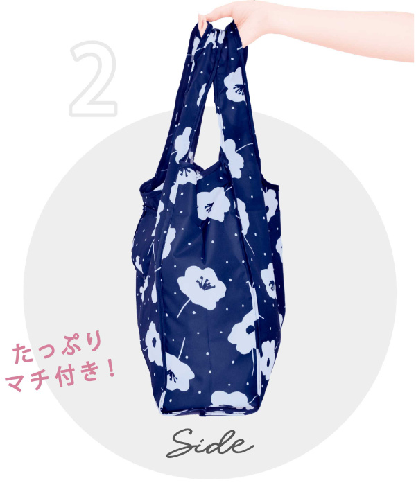 たっぷりのマチ(約13cm)付きで傾けたくないお肉やお惣菜も入れやすいです。また、持ち手も幅広いので、肩にかけたり腕に持つときに痛くなりにくいです。