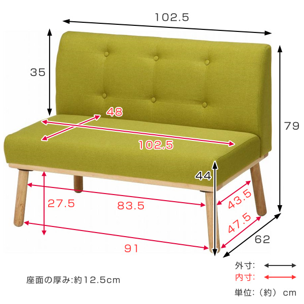 | サイズ | 約 幅102.5×奥行62×高さ79(cm) 座面高:約 44(cm) クッション:約 縦44×横44(cm) |