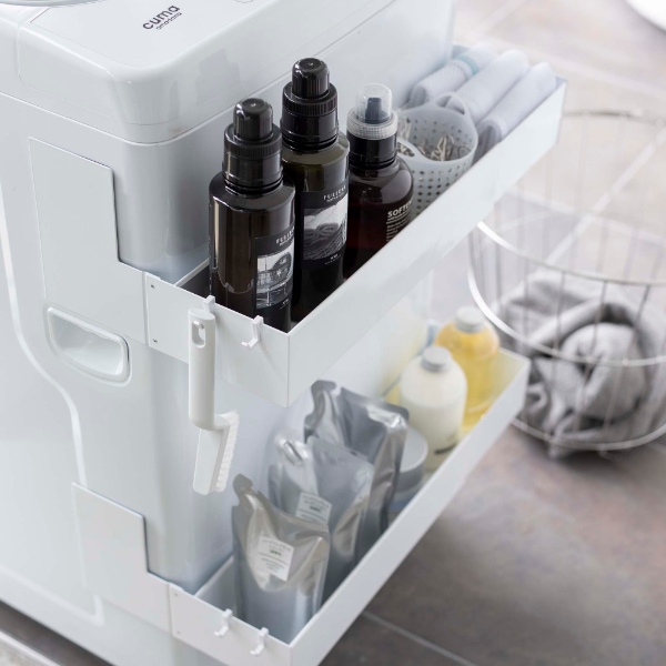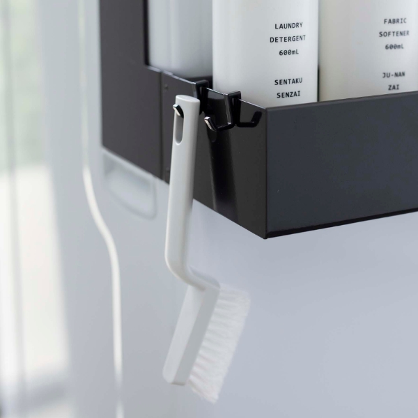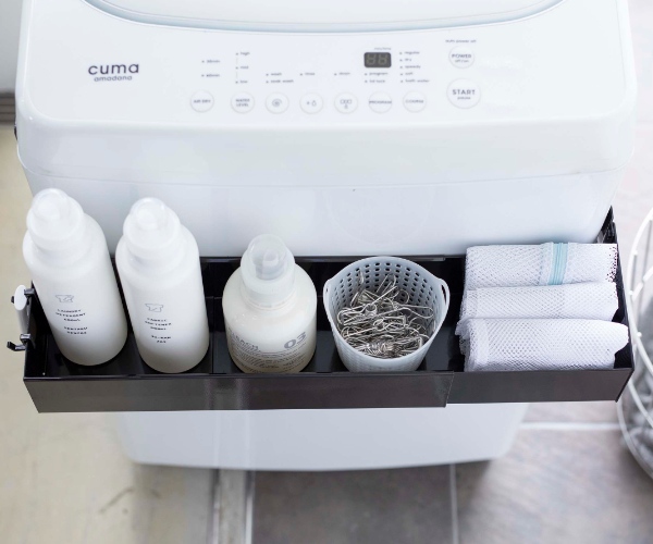 洗濯機の側面にマグネットをくっつけて、洗剤ボトルや洗濯ネットなどをスッキリ収納できます。洗濯機の手前に収納できるので、作業もスムーズになります。
