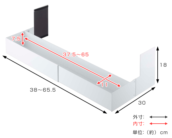 | サイズ | 外寸:約 幅65.5×奥行30×高さ18(cm) 内寸:約 幅65×奥行11×高さ7.5(cm) 伸縮幅:38〜65.5cm |