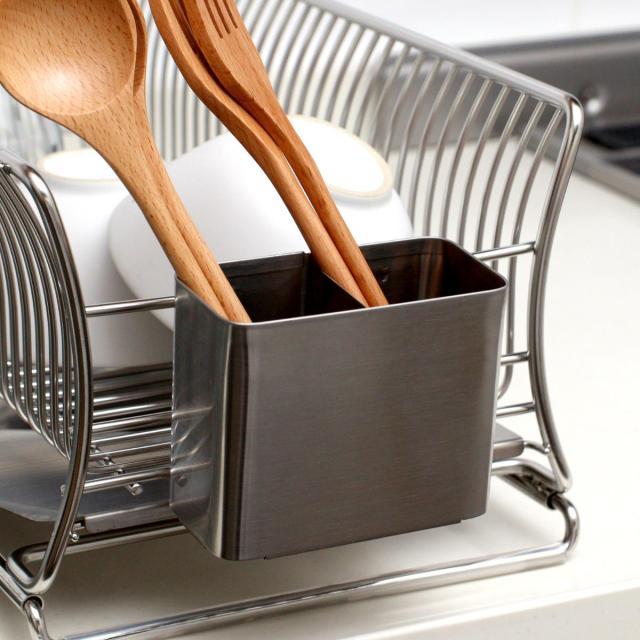 スタイリッシュなオールステンレス製のカトラリーポケットです。使用している水切りかごに引っ掛けるだけで、簡単に水切りスペースを増やすことができます。耐久性に優れたステンレス製で変形しにくく、サビにくい特長もあるのでお手入れが簡単で長く愛用していただけます。