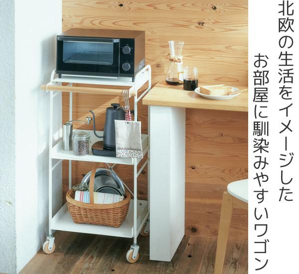 スチール×天然木で、お部屋に馴染みやすいおしゃれなワゴン。天然木の取手には、ミトンや布巾などの小物が掛けられます。