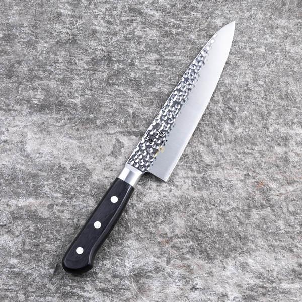 槌目模様が美しい牛刀包丁です。しっかりと握れるハンドルサイズで男性にも使いやすいです。牛刀包丁は肉、魚、野菜など広い用途に対応しており、刺身包丁としても使えます。