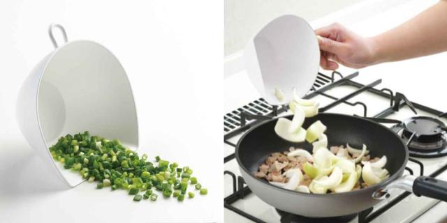 ちりとり型だから、切った食材をちりとりの様にサッとすくえます。小口切りにしたネギや、切った野菜をフライパンに移す際も、小回りがきいてとっても便利です。このボウルを使えばサッとラクラクこぼさずに移すことができます。