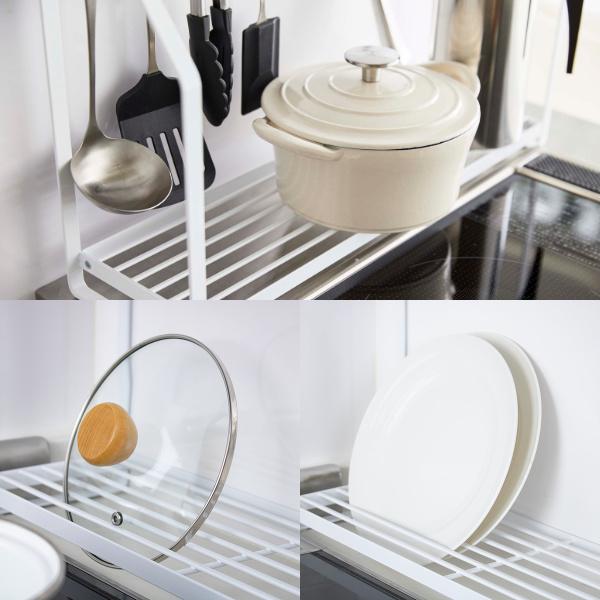 耐荷重5kgと丈夫なので、重さのあるお鍋やフライパン、やかんなどを収納していただけます。棚板は熱がこもりにくい形状で、熱源のそばでも安心です。棚板の隙間を利用して、鍋蓋や盛り付け用のお皿の一時置きにも。