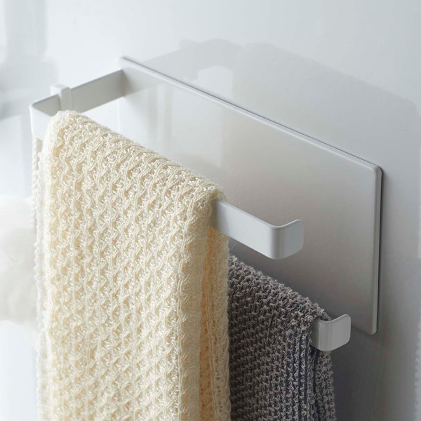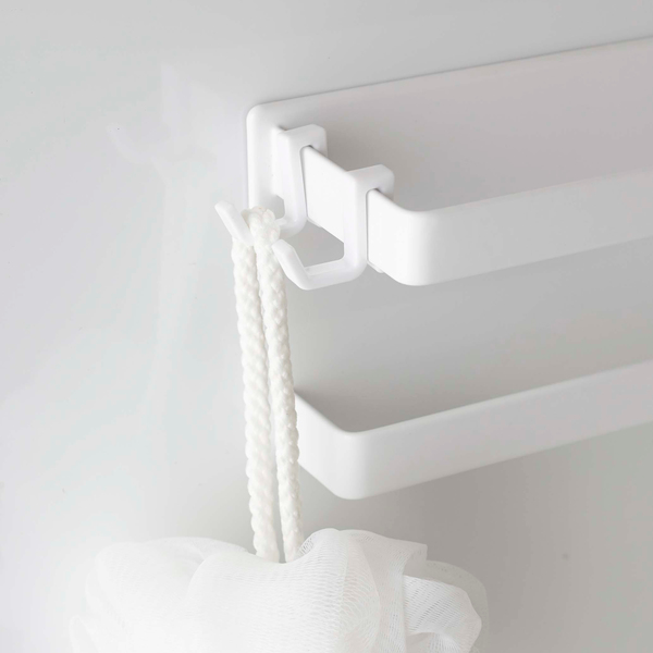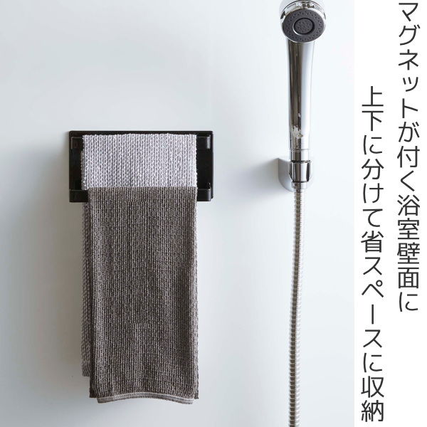 磁石の付く壁面の好きな場所に簡単に取り付けできる2段タイプのタオルハンガーです。ボディタオルを上下2段に分けて2枚収納できます。シンプルですっきりとしたデザインは、まるで備え付けのようにバスルームに馴染みます。