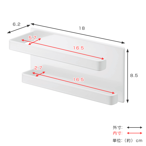 | サイズ | 約 幅18×奥行6.2×高さ8.5(cm) 上部ハンガー内寸:約 幅16.5×奥行5.7(cm) 下部ハンガー内寸:約 幅16.5×奥行2.7(cm) |