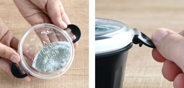 蓋裏のパッキンと2点ロックでしっかり固定できるので、汁漏れしにくく、持ち運ぶ時も安心です。閉める時もカチッと音がするので閉め忘れがありません。