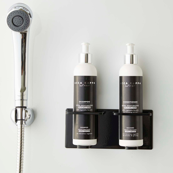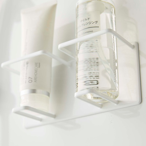磁石の付く壁面に取り付けできるチューブ&ボトルホルダー、Mサイズダブルです。洗顔やクレンジングなどのチューブやボトルをまとめて収納できます。そのままポンプを押してもズレにくく、快適にお使いいただけます。
