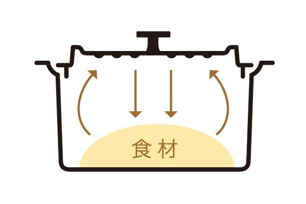 蓋の裏面が食材から出た蒸気を効率よく循環させて水滴が落ちやすい構造なので、少量の水分で調理することが可能です。