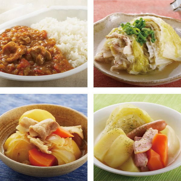 カレーライス、白菜と豚バラ肉の煮物、肉じゃが、ポトフなど、無水調理が初めての方でも安心のレシピ付きです。