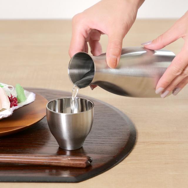 ちょっと贅沢な気分になれる美しいステンレス製の徳利と猪口のセットです。徳利は真空二重構造のため卓上で長時間お好みの温度をキープできます。日本酒が美しく映えるステンレス製の猪口が2個付いています。