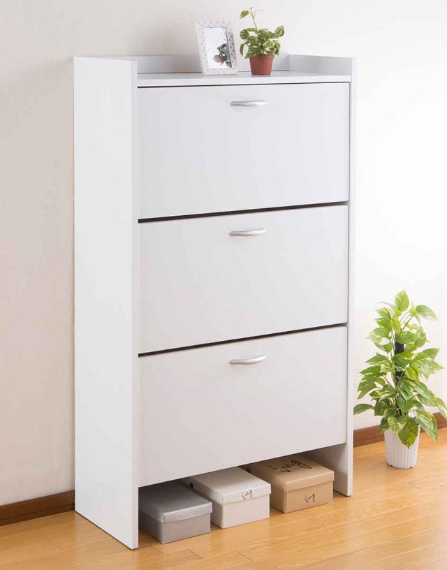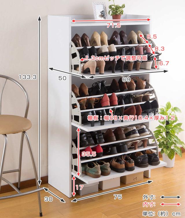 シューズラック 3段 幅75cm 奥行30cm スリム ( 下駄箱 靴箱 靴 収納 大容量 玄関収納 収納棚 靴収納 靴収納棚 36足収納 省スペース 薄型 玄関 フラップ棚 仕切り 調節可能 背面換気口付き ブラウン ホワイト )