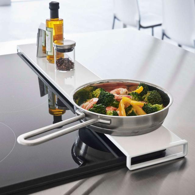 よく使う調味料や、お料理中のフライパンやお鍋の一時置きにも便利です。今まで使えてなかった排気口周りやコンロ奥のデッドスペースを有効活用することで、収納スペースが広がるだけでなく、作業効率もアップします。