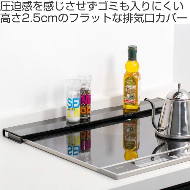 高さが約 2.5cmと低めなので、調理中のゴミなども入りにくい排気口カバー。圧迫感が少ないフラットタイプで目立たずスタイリッシュに置けて、飛び散る油や調理汚れから排気口を守ります。また、単に油ハネを防止するだけでなく、排気口が隠れることで、コンロ周りをシンプルにスッキリと見せてくれます。