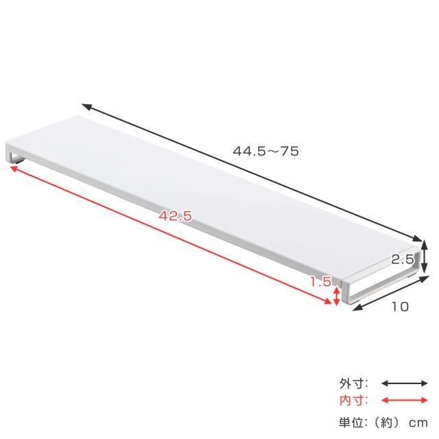 | サイズ | 外寸:約 幅44.5×奥行10×高さ2.5(cm) 内寸:約 幅42.5×高さ1.5(cm) 幅:約 44.5〜75cm伸縮式 |
