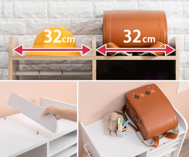 ラック上部はランドセル置きにお使いいただけます。幅がランドセルの大きさにぴったりです。中央の仕切りは取り外し可能で、外して天板を広々と使うこともできます。