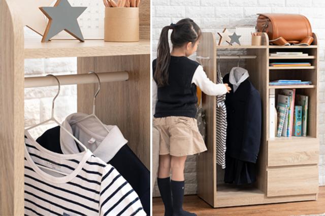 小学1年生にも使いやすい高さで設計された収納ラックは、お子さまの目線に合わせて使えるので、自分で片付ける習慣を身に付けやすい仕様になっています。多彩な収納はランドセルも制服も2人分収納が可能。兄弟、姉妹で仲良くお使いいただけます。