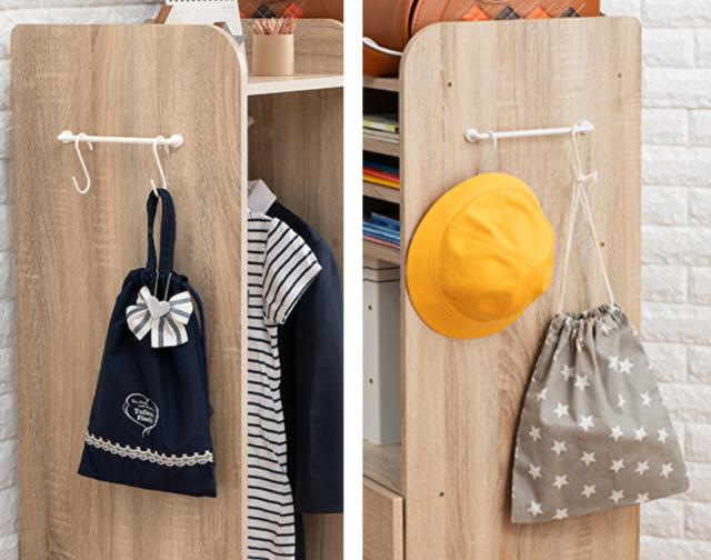 サイドフックは左右お好きな方に取り付けることができます。どちら側にも取り付けられるので、コーナーにも設置可能で使う場所を選びません。S字フックが2個付属しているので、シューズケースや体操服入れなどを引っ掛けて便利にお使いいただけます。