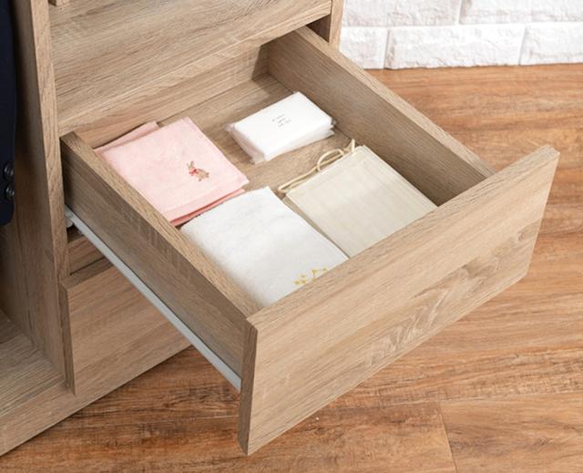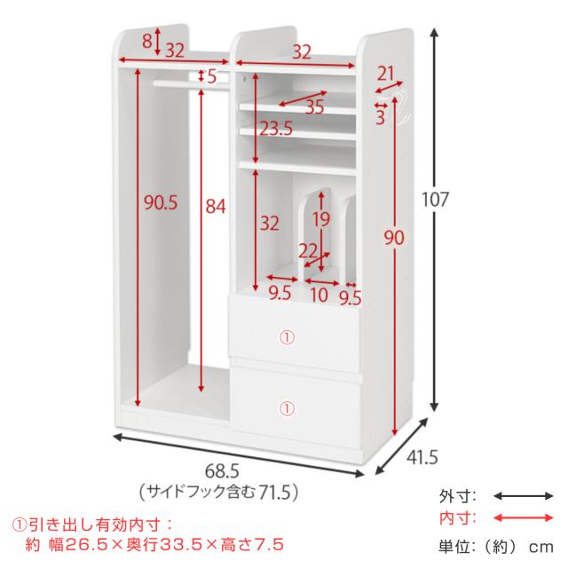 | サイズ | 約 幅68.5×奥行41.5×高さ107(cm) サイドフック含む幅:約71.5(cm) 引き出し有効内寸:約 幅26.5×奥行33.5×高さ7.5(cm) |
