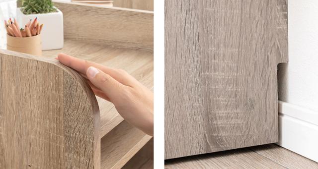 | お子さまに優しい安心形状 角は丸みがある形状になっているので、お子さまにも安心してお使いいただけます。 | 巾木カットでぴったり壁付け ラックをぴったりと壁付けできることで、背面に隙間ができないのでお子さまが手などを挟む心配もなく、また上に置いている物が後ろに落下してしまうのを防ぐことができます。 |